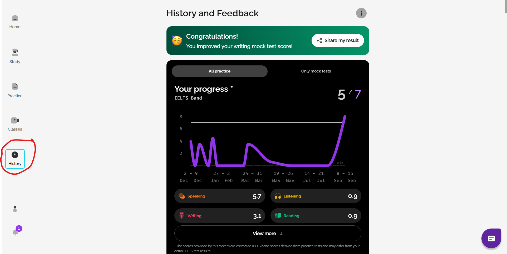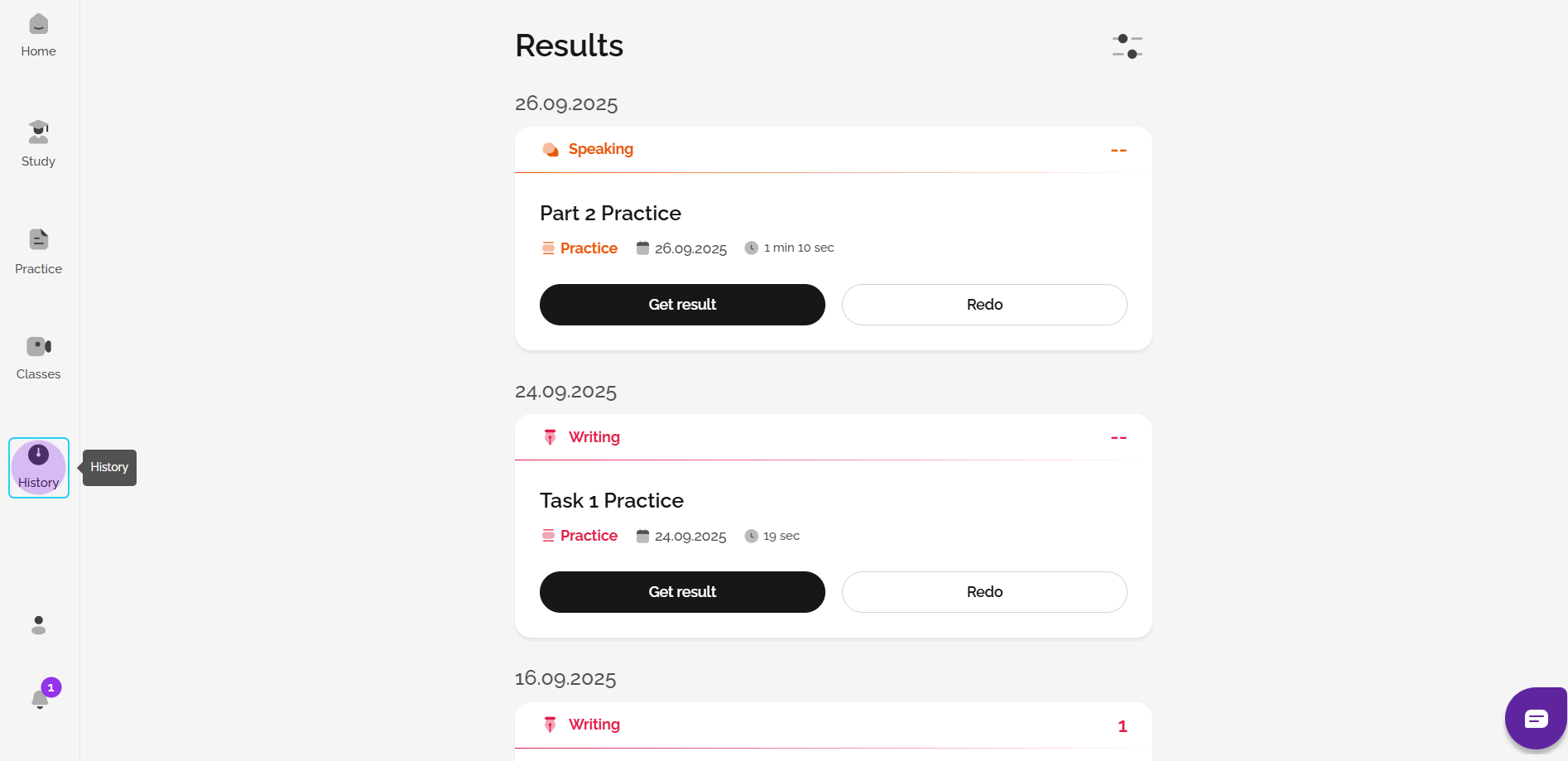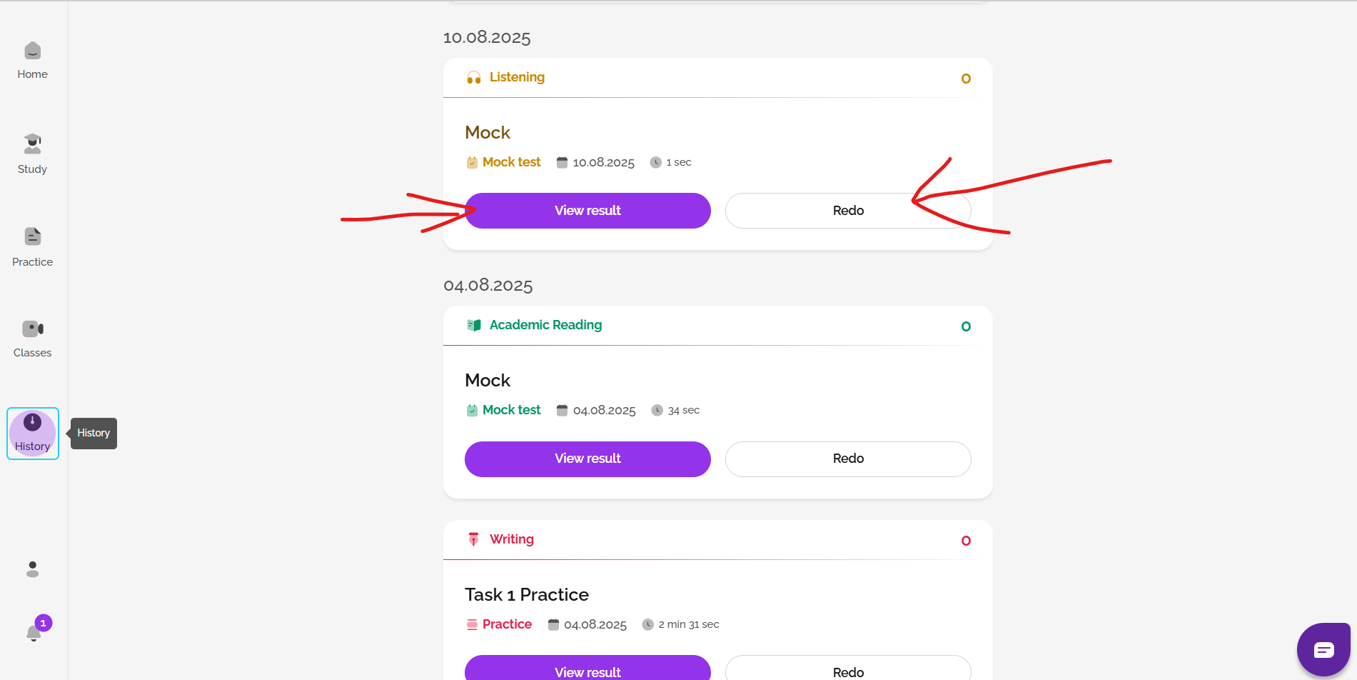 If you want AI scoring and feedback for any Speaking or Writing practice you have done, you can buy a Gateway or Advantage FlexCheck AI package. You will then receive feedback on your work, including anything saved on your History page, until your test date. Go to profile and then package to see your options.