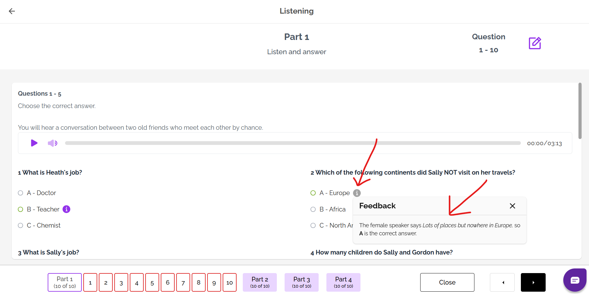 When viewing Reading and Listening work, you can see feedback on correct and incorrect answers.
