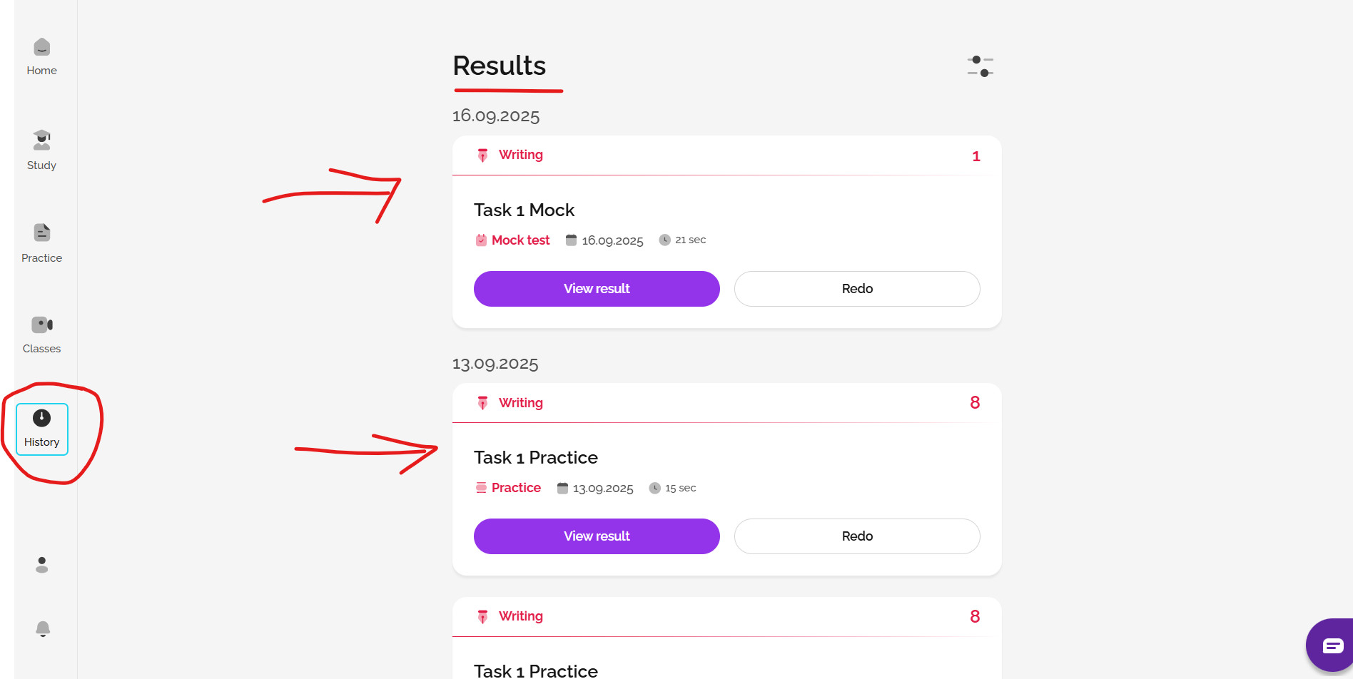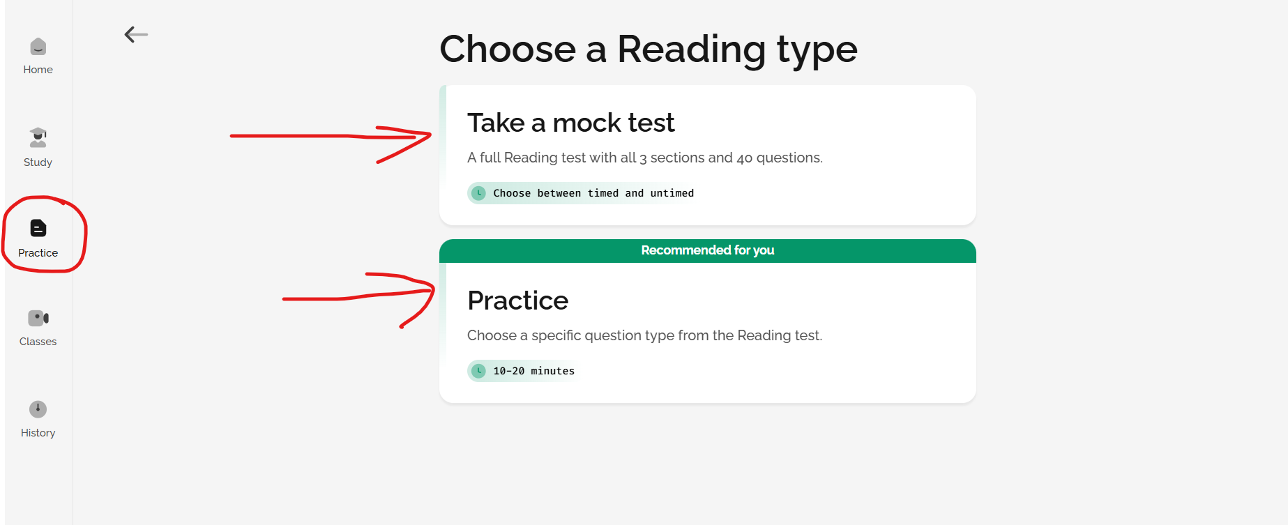 The Practice section allows you to complete full mock tests, or practice individual writing tasks, speaking parts and question types for reading and listening. Click on the Practice section on your sidebar menu and choose the skill and type of practice you want to do: mock test or practice.