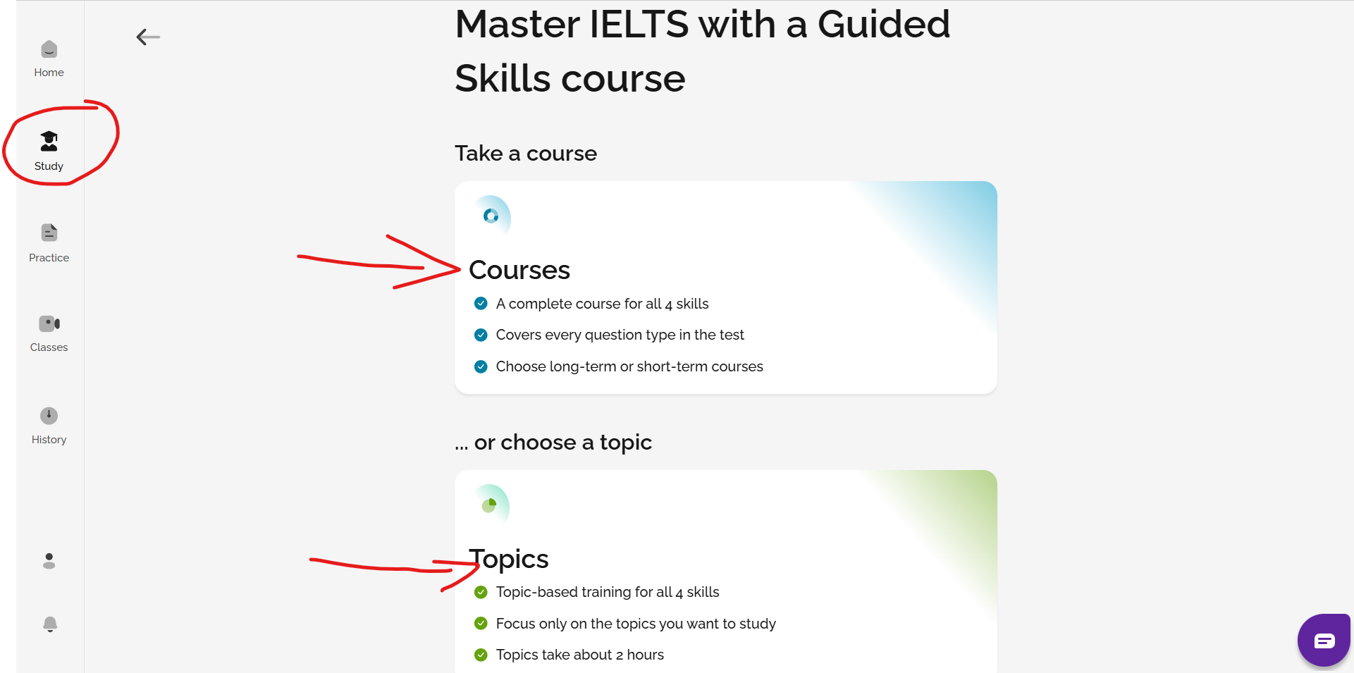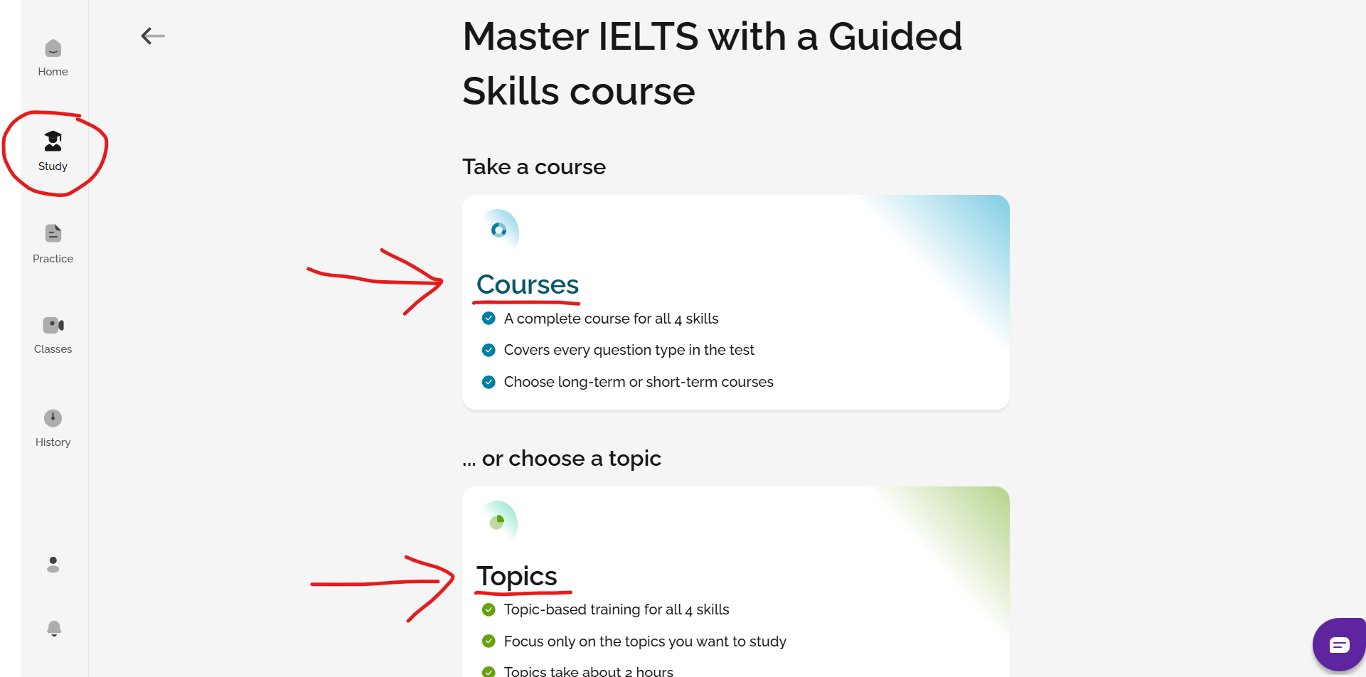 You can select a full course or a topic by skill to work on in the Study section of the site. The courses and topics will get you familiar with the format of the test and how to best prepare for it with classes, training and practice exercises.