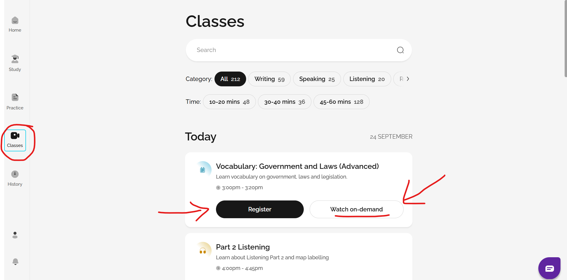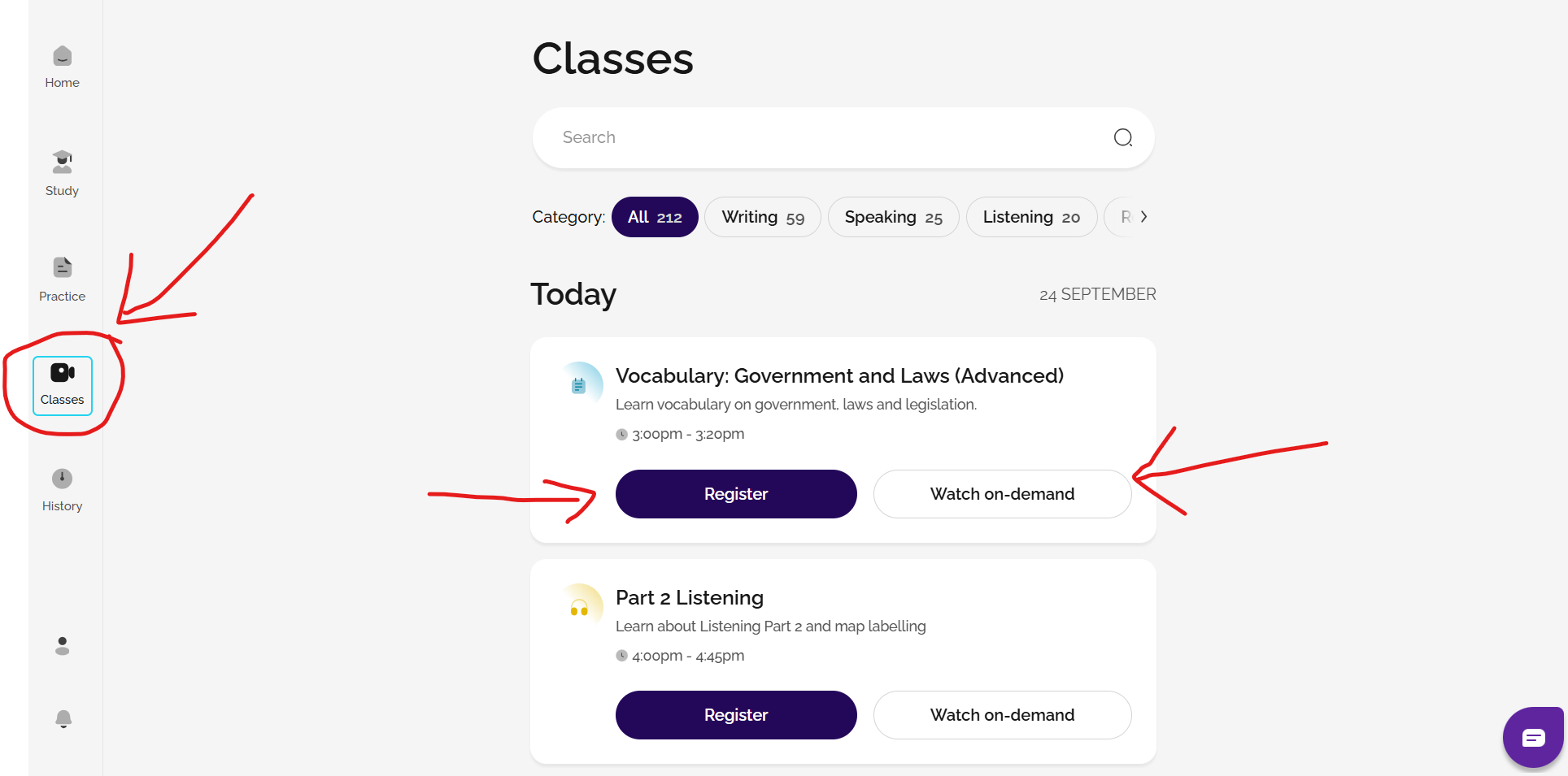 We offer daily live webinars on all IELTS topics and general English to help you to improve! You can register to join the live class, or watch a pre-recorded on-demand class if you cannot attend. Choose Classes from the menu to see your options.