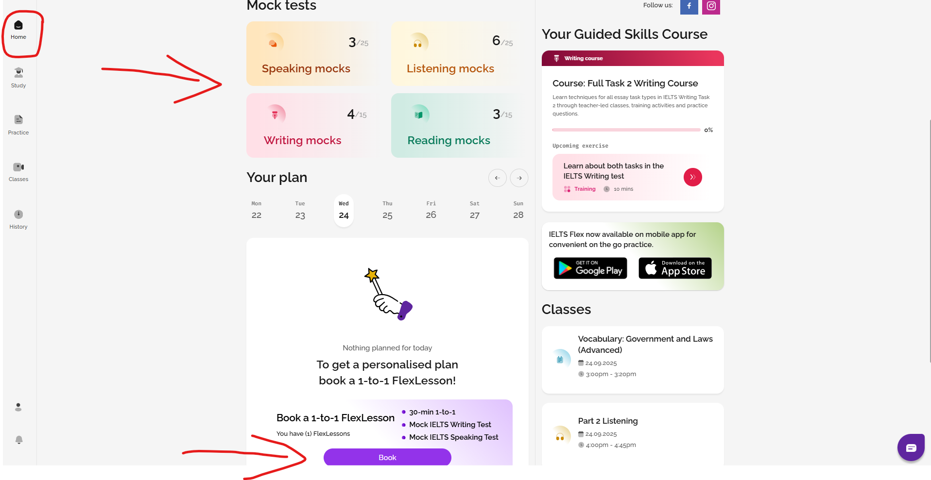 You can also choose to take a full Mock test. Go to Home, choose a skill and start your mock test. You can also book a 1-to-1 FlexLesson session with a tutor here if you would like some guidance or a personalised study plan.