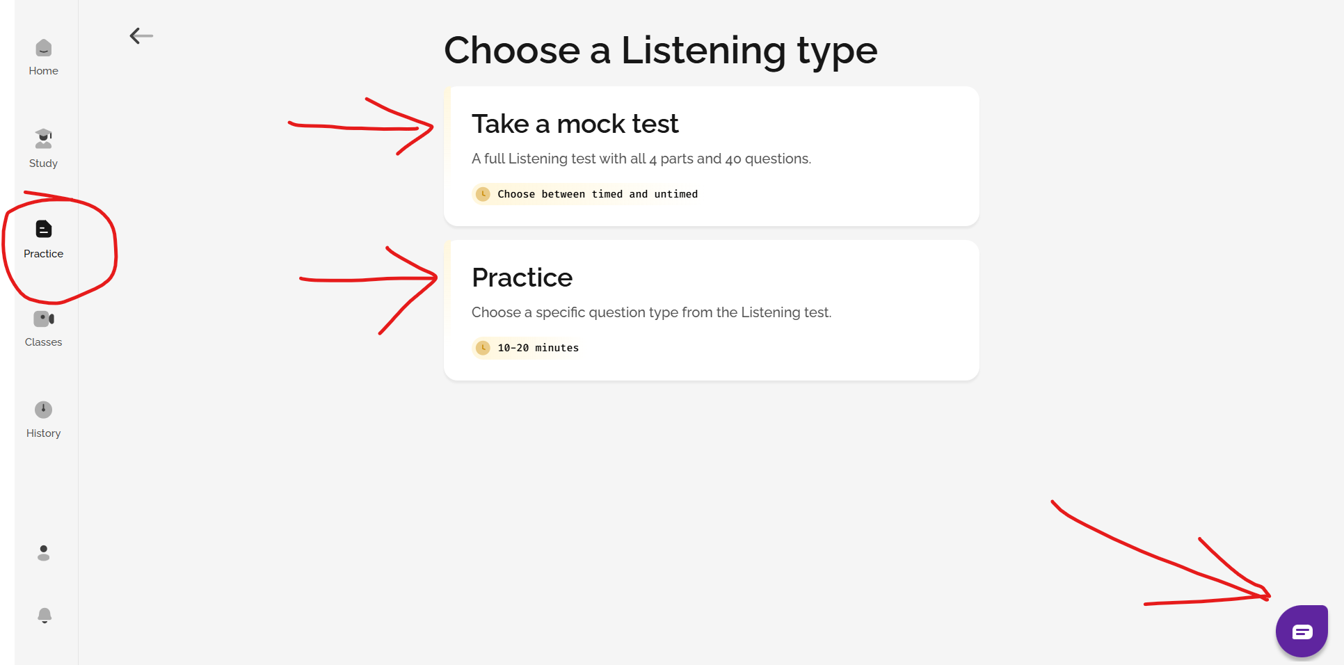 You can do full mock tests and also practice different question types for Reading, Writing, Listening and Speaking in the Practice section.