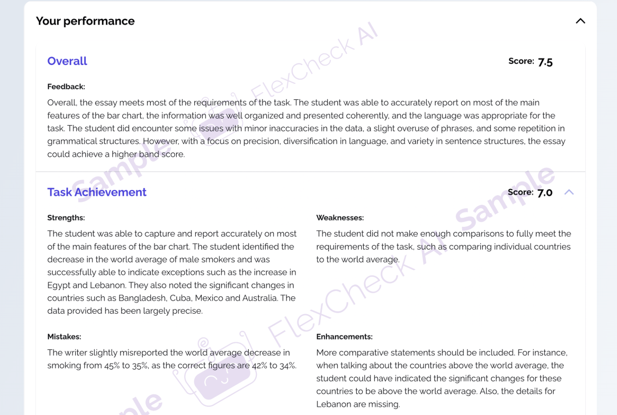 For every piece of Writing or Speaking practice or mock test that you complete, you can choose FlexCheck AI feedback, which will give you a breakdown of your score based on the IELTS marking criteria, written feedback, a vocabulary analysis and (for Speaking) pronunciation correction.