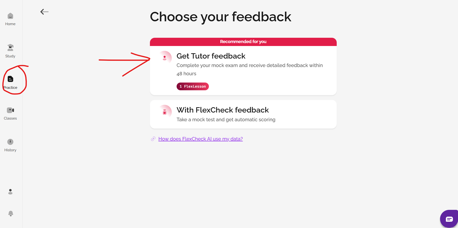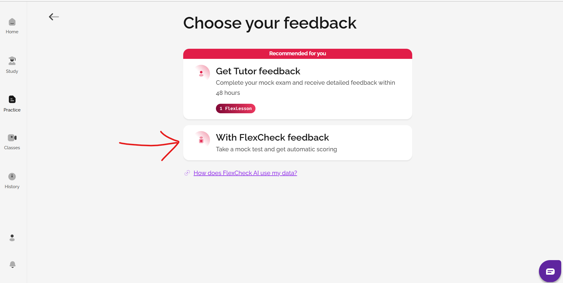 When you choose to do a mock test from the Practice area, you can select With FlexCheck feedback. After you finish a piece of Speaking or Writing practice in the Practice section, you can also choose to add FlexCheck AI. Go to History, find the practice activity or mock exam, and choose Get result.