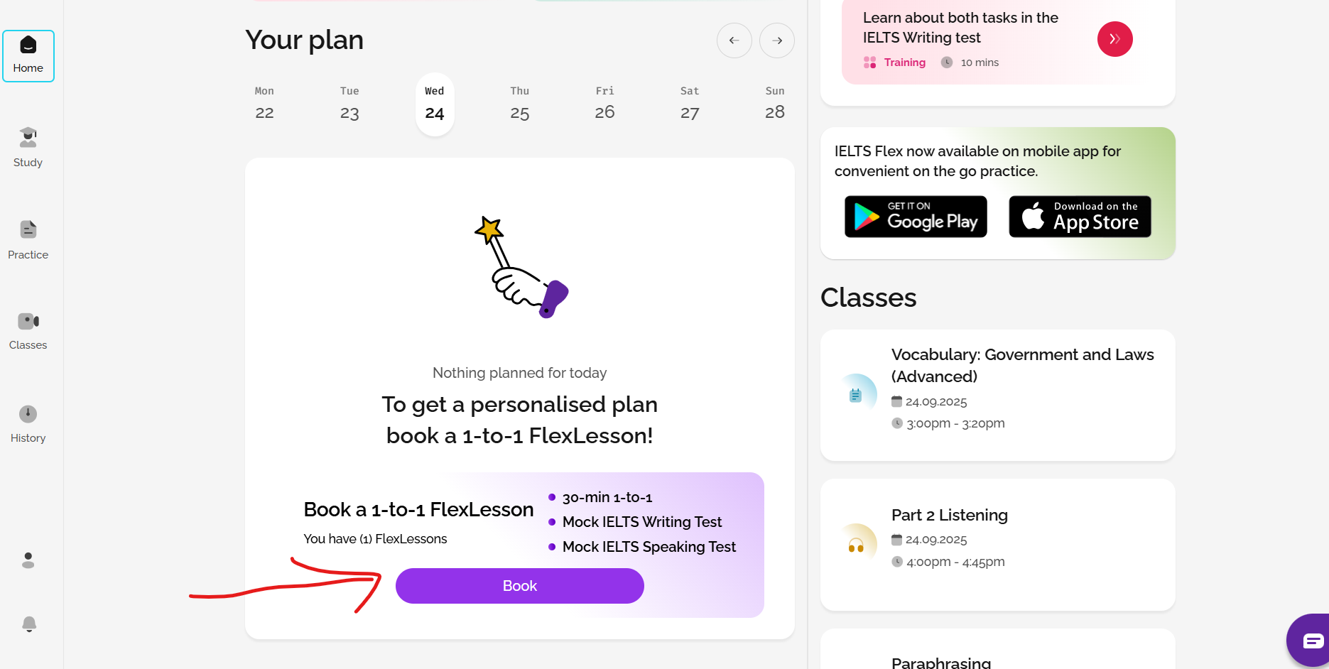 Please note that this service is only available if you have FlexLessons. You can book tutoring sessions from the Home page or the Practice section. You can buy FlexLessons by going to profile and then package.