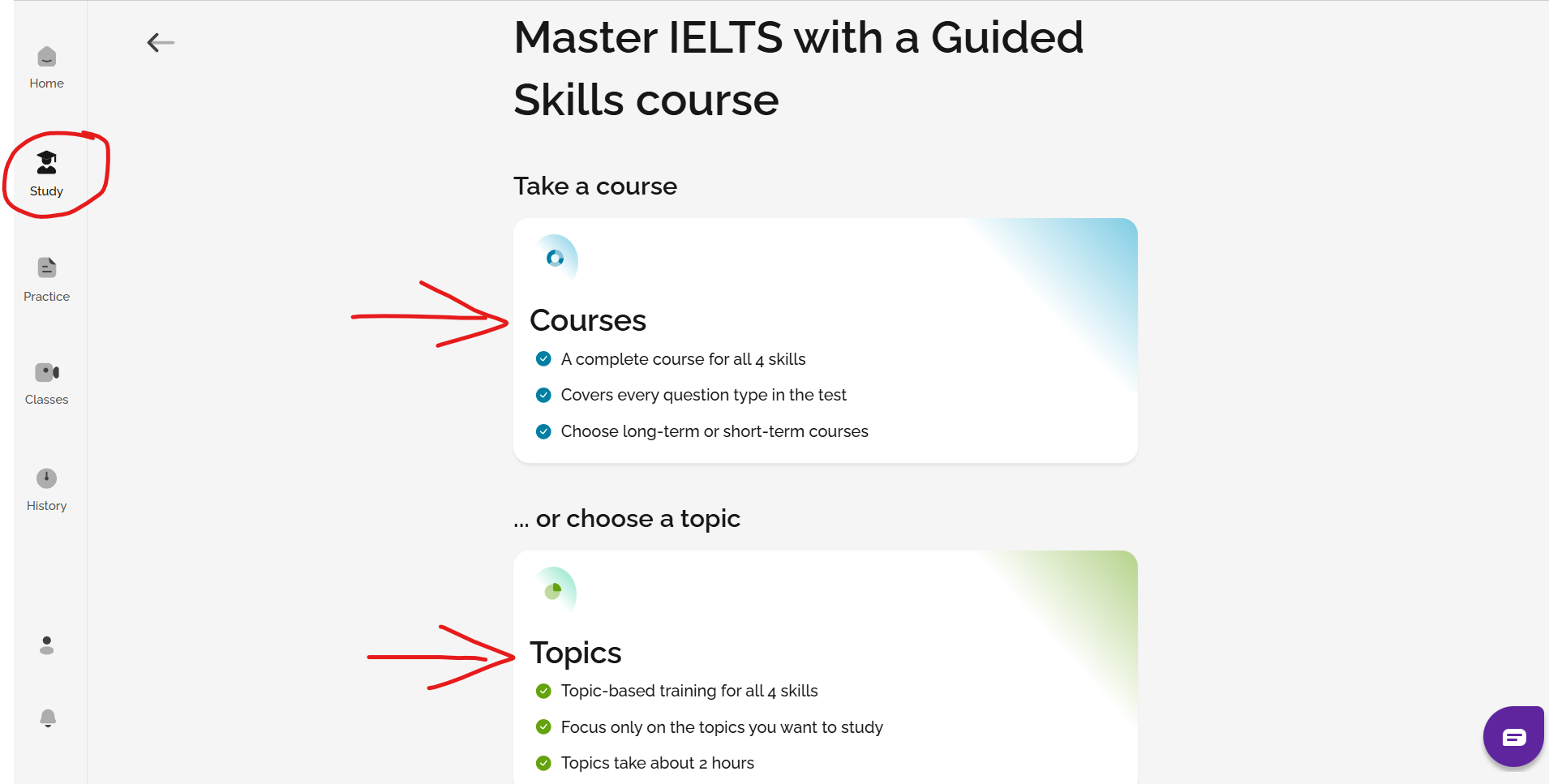 The Study area of the site contains our Topics and Courses for each IELTS skill: Writing, Speaking, Reading and Listening.