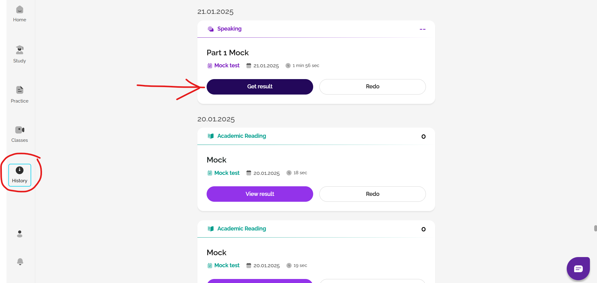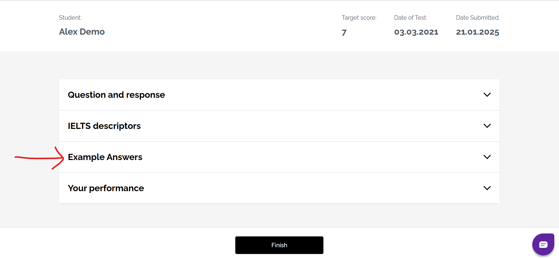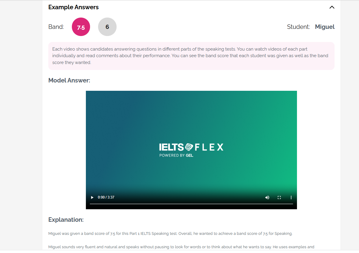 Also, check out Speaking example answers in the History area once you have completed a Speaking practice task. Here, you can watch videos of students taking IELTS Speaking exams and read examiner comments on their performance. Just click view result / get result and then scroll down to example answers.