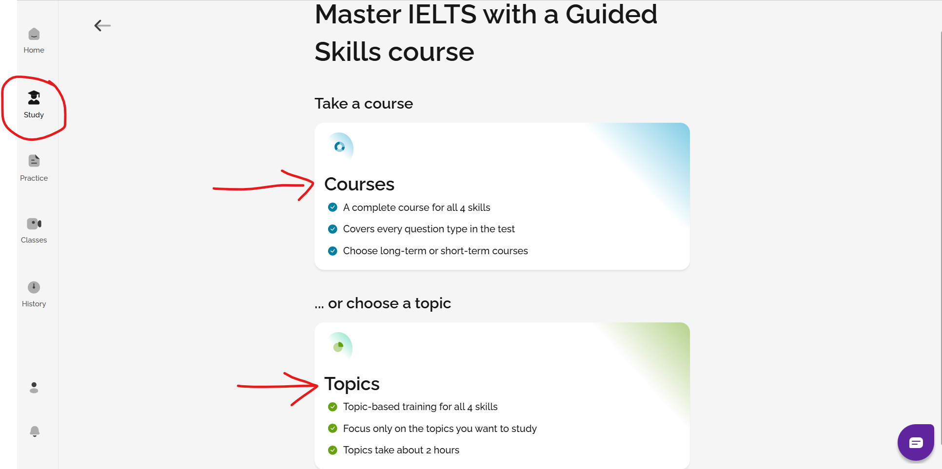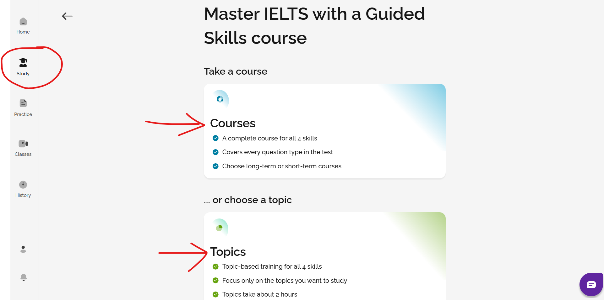 You can select a Speaking course or a topic to work on in the Study section of the site. The courses and topics will get you familiar with the format of the test and how to best prepare for it with classes, training and practice exercises.
