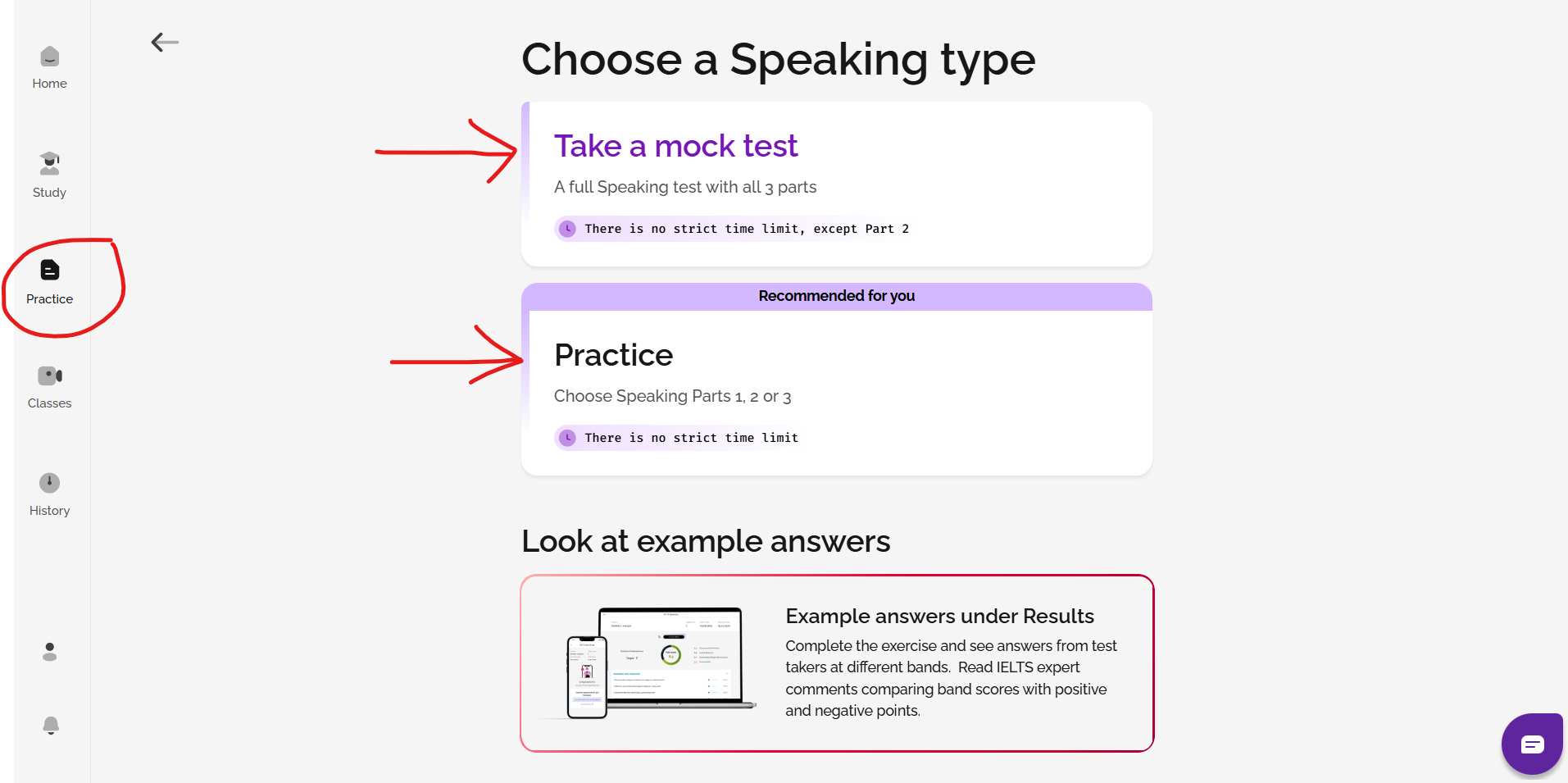 You can take full Speaking mock tests or individually practise each part of the Speaking exam in the Practice section.