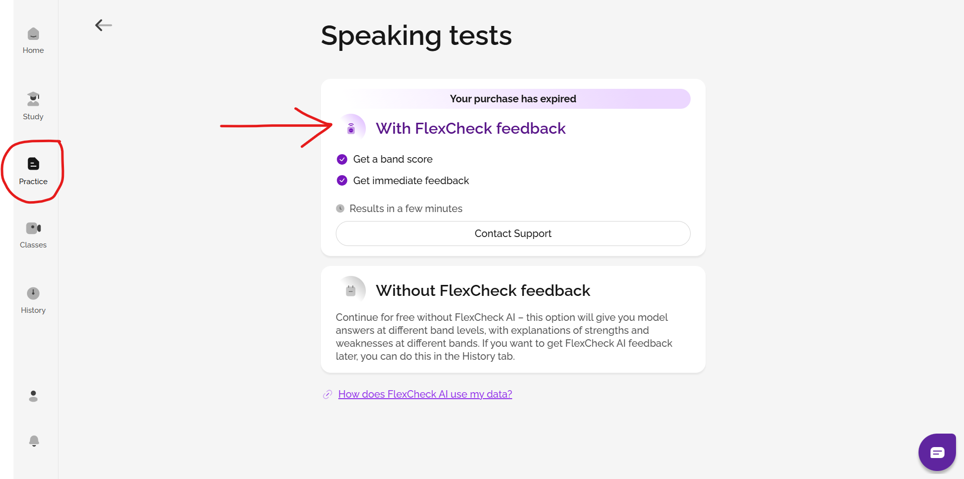 If you would like FlexCheck AI feedback and scoring on any Speaking practice that you do/have done, you can purchase a Gateway or Advantage FlexCheck AI package. Go to Profile and Package to see your options.