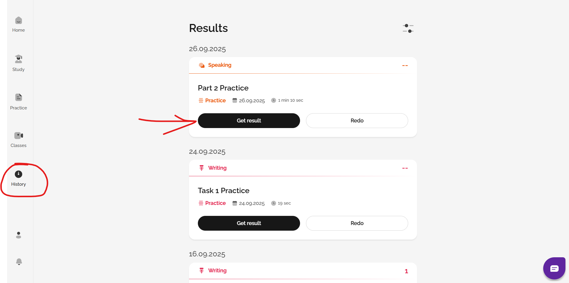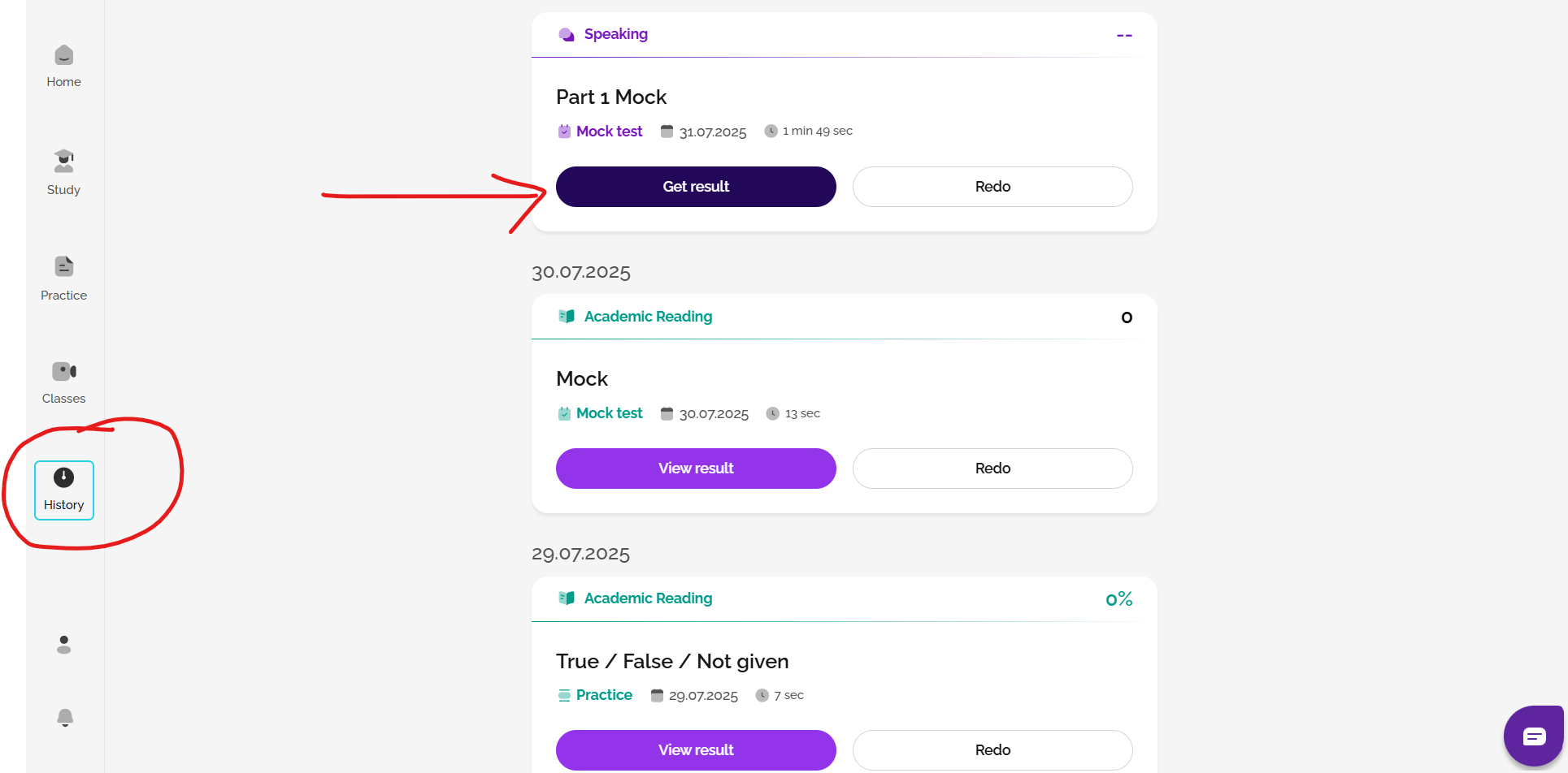 For FlexCheck AI feedback on practice tasks, you will need to go to your History area and click get result in order to get your feedback after completing the task.