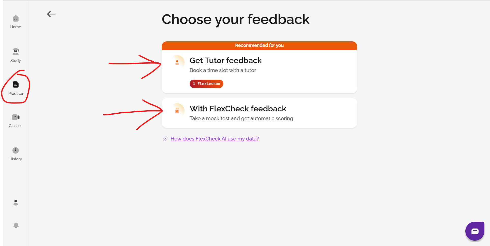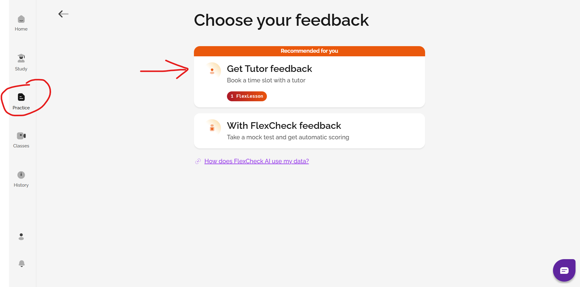 If you would like Tutor feedback on your Speaking, you can purchase FlexLessons. You can use these to take a full Speaking mock test with a tutor. Use the Practice section and select Get Tutor feedback to book your live mock Speaking test with a tutor.