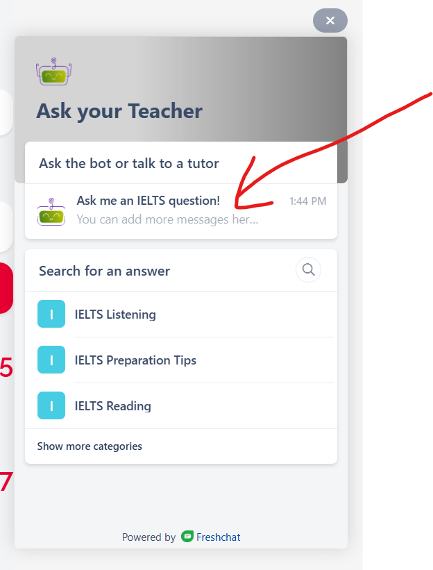 On our IELTS sites, we have a friendly IELTS chatbot located in the bottom right-hand corner of every page. The chatbot is trained to answer your IELTS questions.
