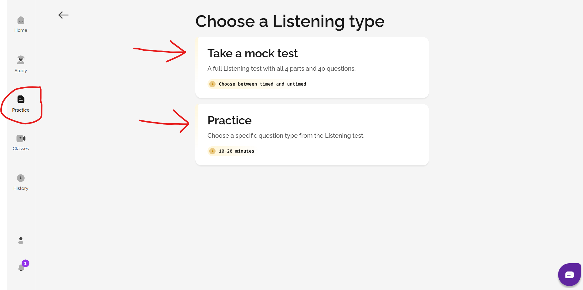 Before you can see feedback, you need to do a Listening practice activity or a mock Listening exam. You can find these by going to the Practice section on the left-hand menu and then choosing Listening.