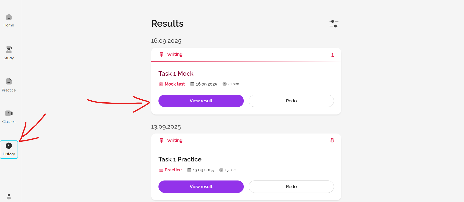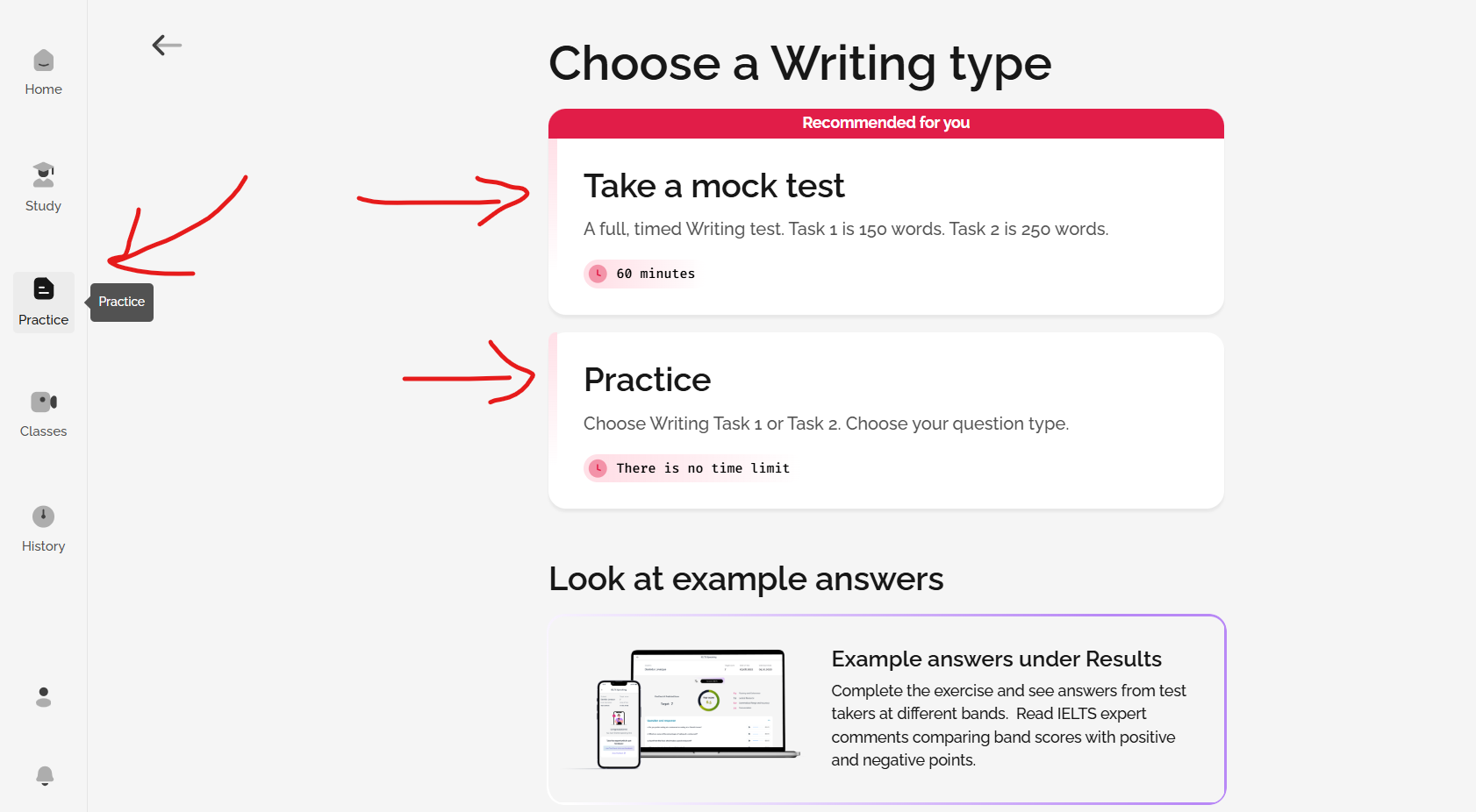 Go to Practice on your menu. Choose Writing or Speaking and then complete a mock test or do a practice question.