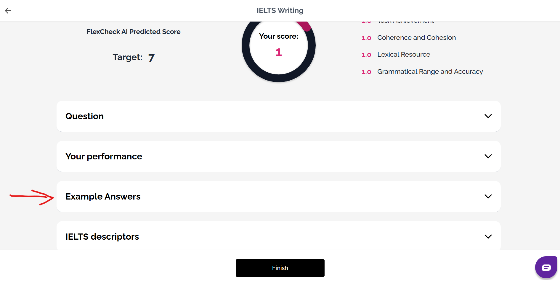For Writing, you can see example answers from bands 5 - 9 for every writing task in the system. Click on the marking criteria (Task Achievement, Coherence and Cohesion, Lexical Resource and Grammatical Range and Accuracy) to see examiner comments.