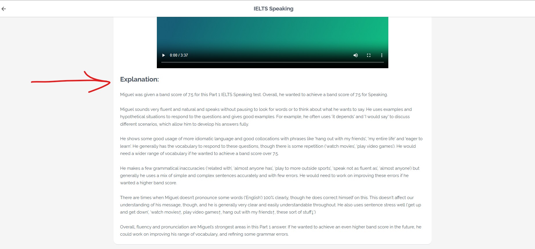 For Speaking, you can see videos of students taking the various parts of the IELTS Speaking test and their band scores. There are videos for students who achieved different band scores and each video has an examiner explanation below: